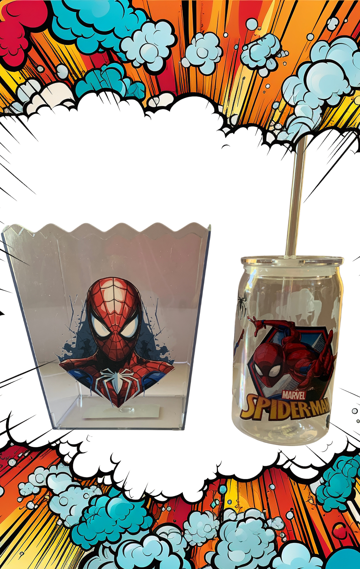 Experience movie night like never before with our SPIDER MAN SNACK SET. This set includes a 160z acrylic tumbler and popcorn holder, both featuring a bold Spiderman decal. Perfect for kids and fans of all ages, this set is a must-have for any movie lover. Upgrade your movie snacks with our SPIDER MAN SNACK SET today